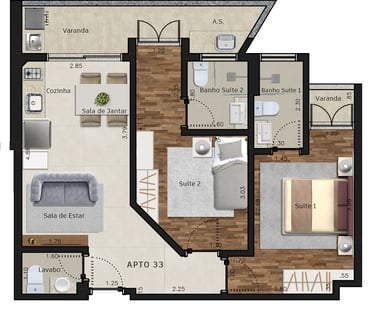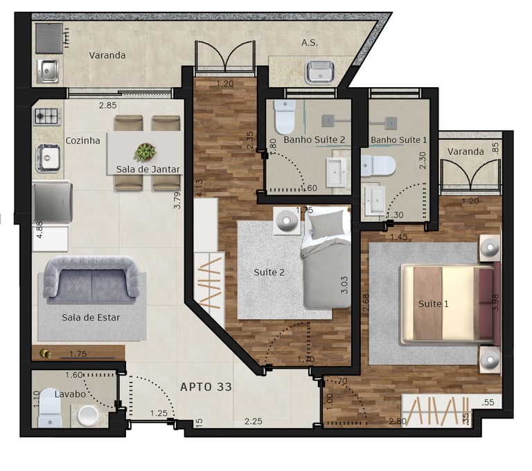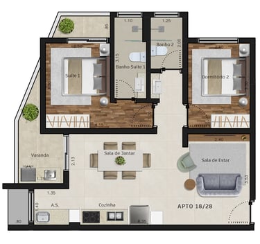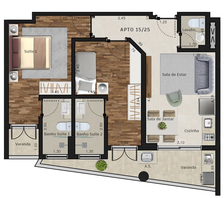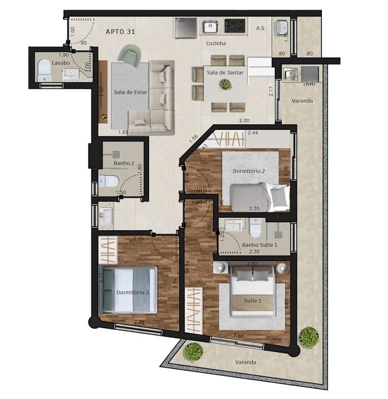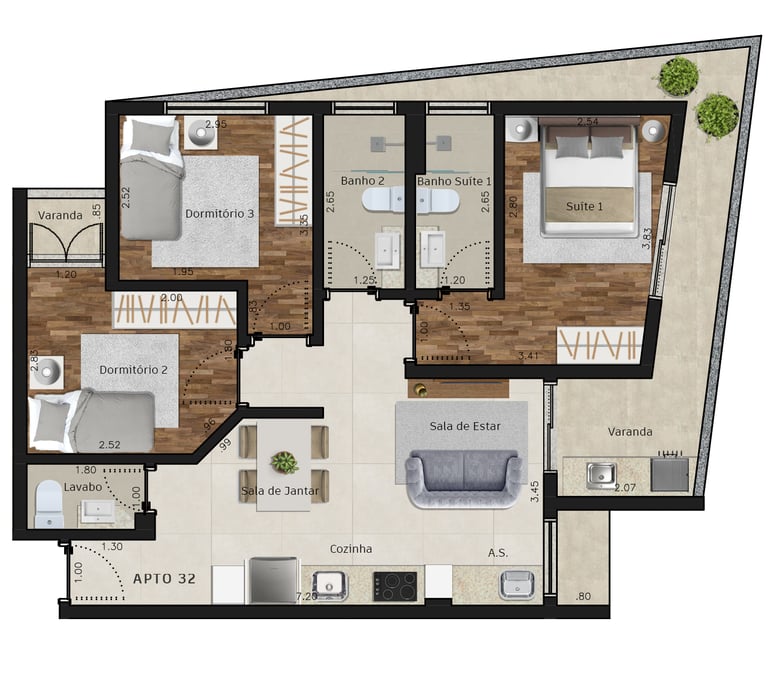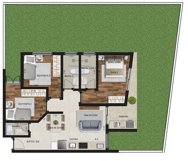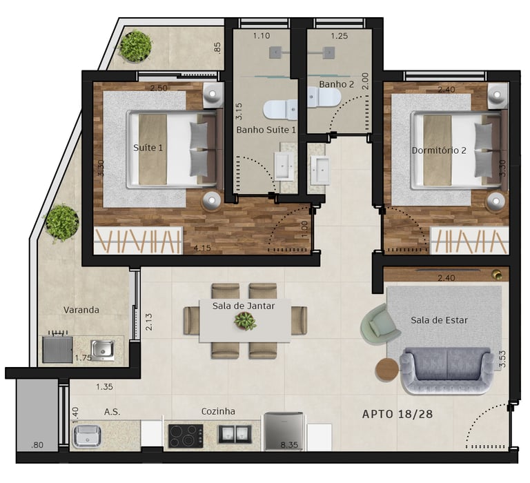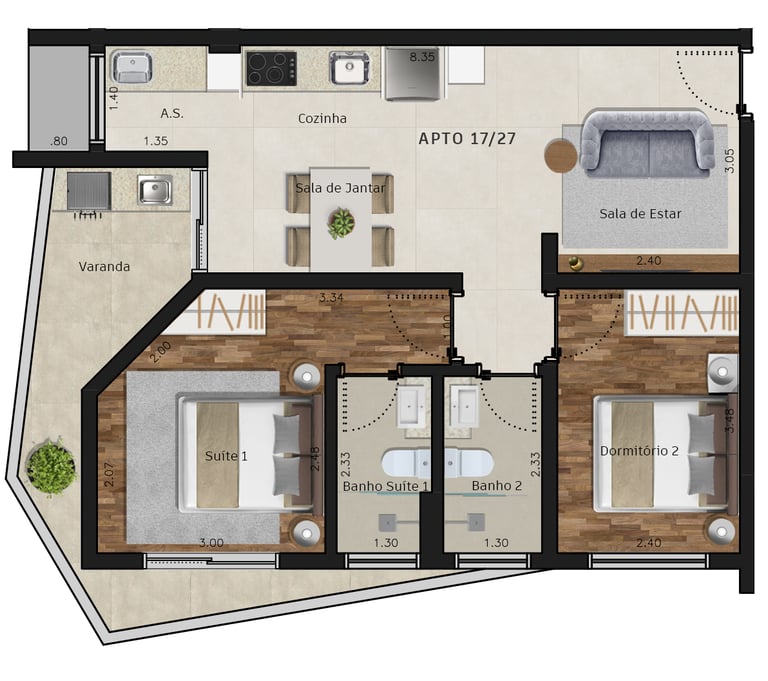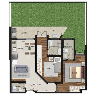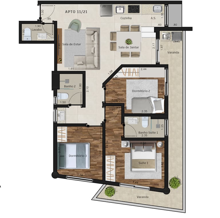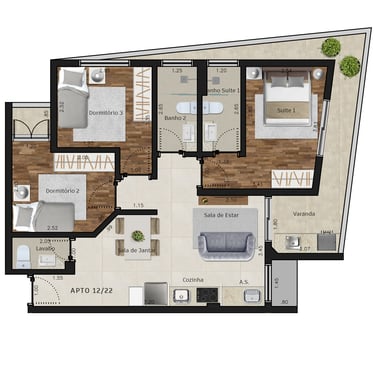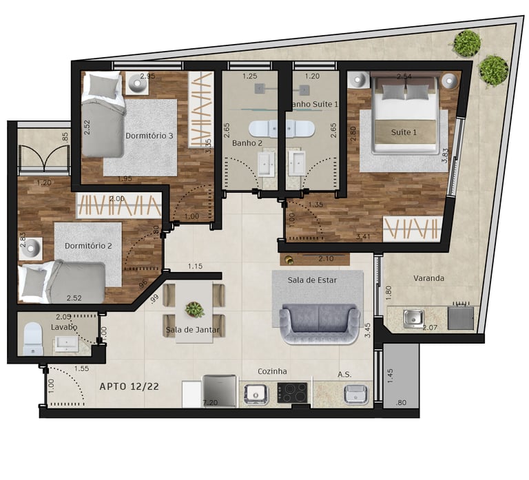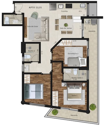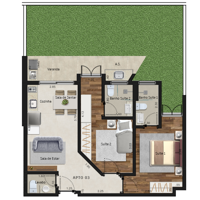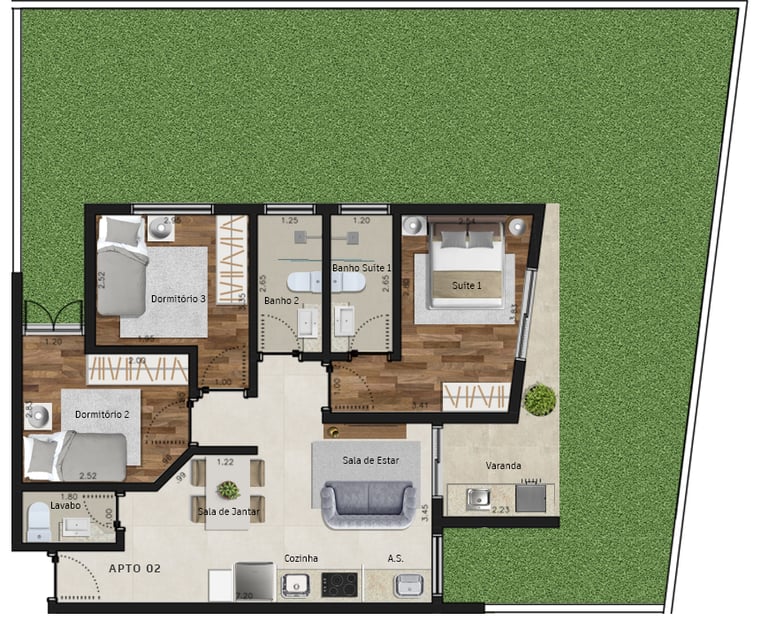 Área dos conjuntos: de 73 m² até 117 m²